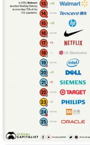 Otra compañía que vale la pena mencionar es Huawei: la compañía tecnológica china ha tomado el sexto lugar, un aumento de 42 posiciones desde 2019. Este aumento en los rangos probablemente se deba a la importante inversión de $ 19 mil millones de la compañía en investigación y desarrollo (I + D) en 2019. Este tipo de inversiones parecen estar dando sus frutos, ya que Huawei vendió más teléfonos inteligentes en 2019 que Apple.